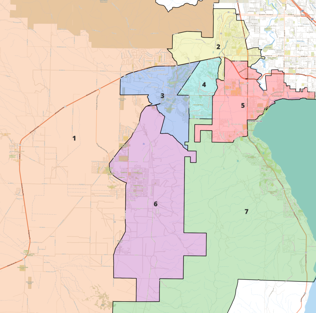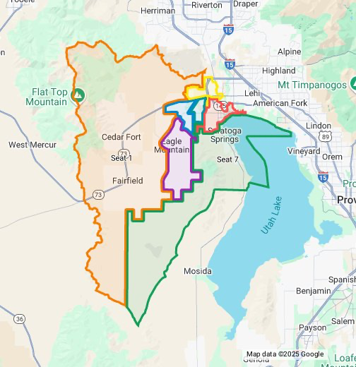 - Seats 1, 6, and 3 are in Eagle Mountain, with Seat 1 also covering Fairfield and Cedar Fort.